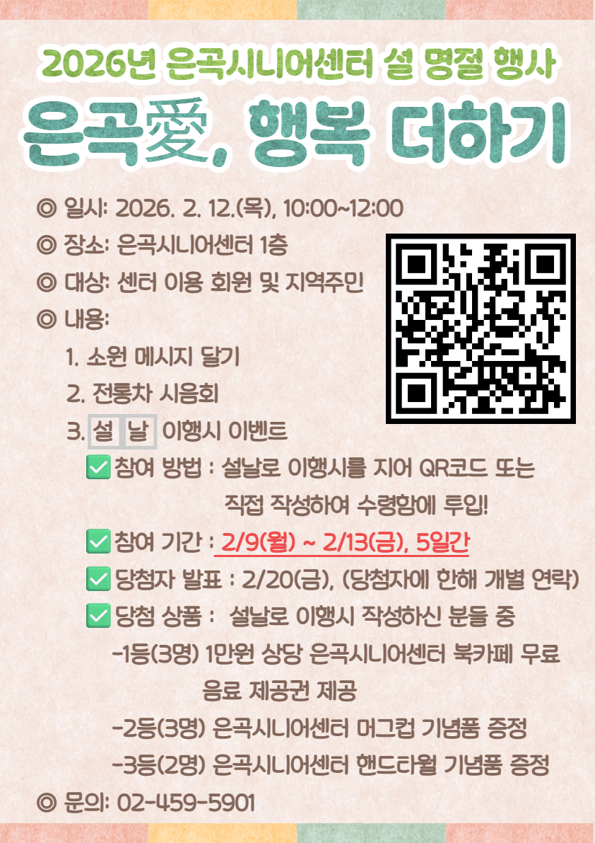[행사] 2026년 은곡시니어센터 설 명절 행사 '은곡애, 행복 더하기' 최고관리자 0 120 02.09 09:30 네이버폼 바로가기: https://naver.me/xSBLa7OZ