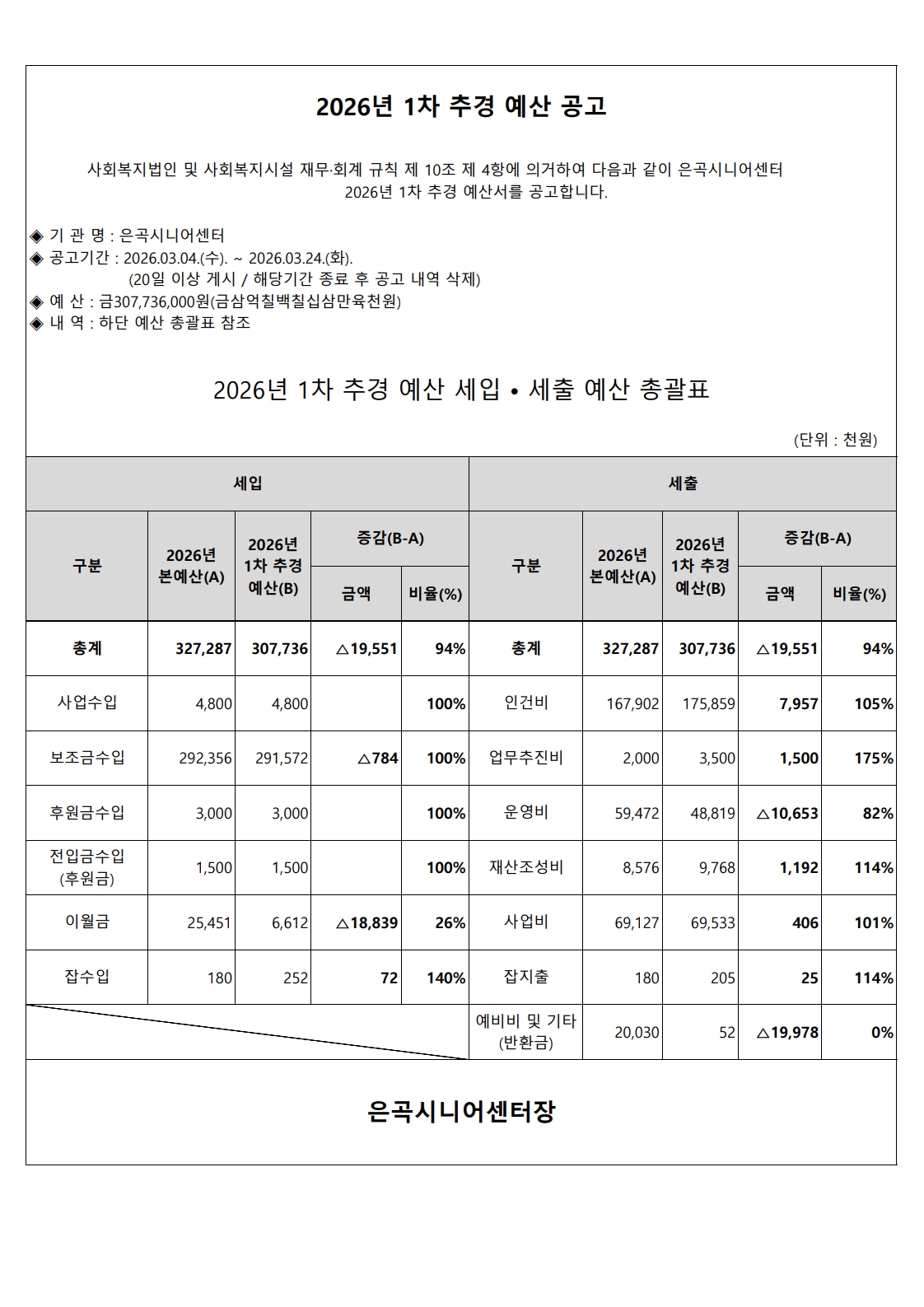2026년 1차 추가경정 예산(안) 공고 최고관리자 0 15 03.04 17:18 2026.03.04 17:18 예산총괄표 2026. 1차 추경.pdf (126.8K) + 2 사회복지법인 및 사회복지시설 재무회계규칙 제10조 4항에 의거하여 은곡시니어센터 2026 회계년도 1차 추가경정예산(안)을 공고합니다.1. 기관명 : 강남구립 은곡시니어센터2. 공고내용 : 2026년 1차 추가경정 예산(안)3. 공고기간 : 2026.03.04.(수). ~ 2026.03.24.(화). (21일) - 해당 기간 종료 후 공고 내역 삭제4. 담당자 : 정영훈 대리(T. 02-459-5901)