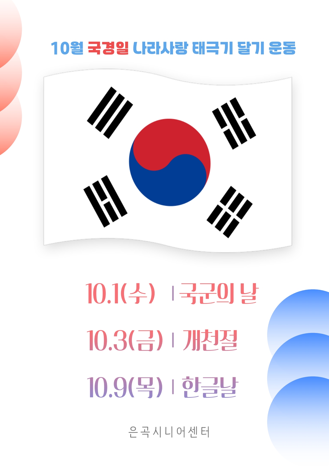 10월 국경일 나라 사랑 태극기 달기 운동 안내 최고관리자 0 193 09.24 11:27 * 10월 국경일 나라 사랑 태극기 달기 운동 안내 * 10.1(수) 국군의 날10.3(금) 개천절10.9(목) 한글날나라 사랑 하는 마음으로 태극기 달기 운동에 적극 동참하여 주시기 바랍니다.