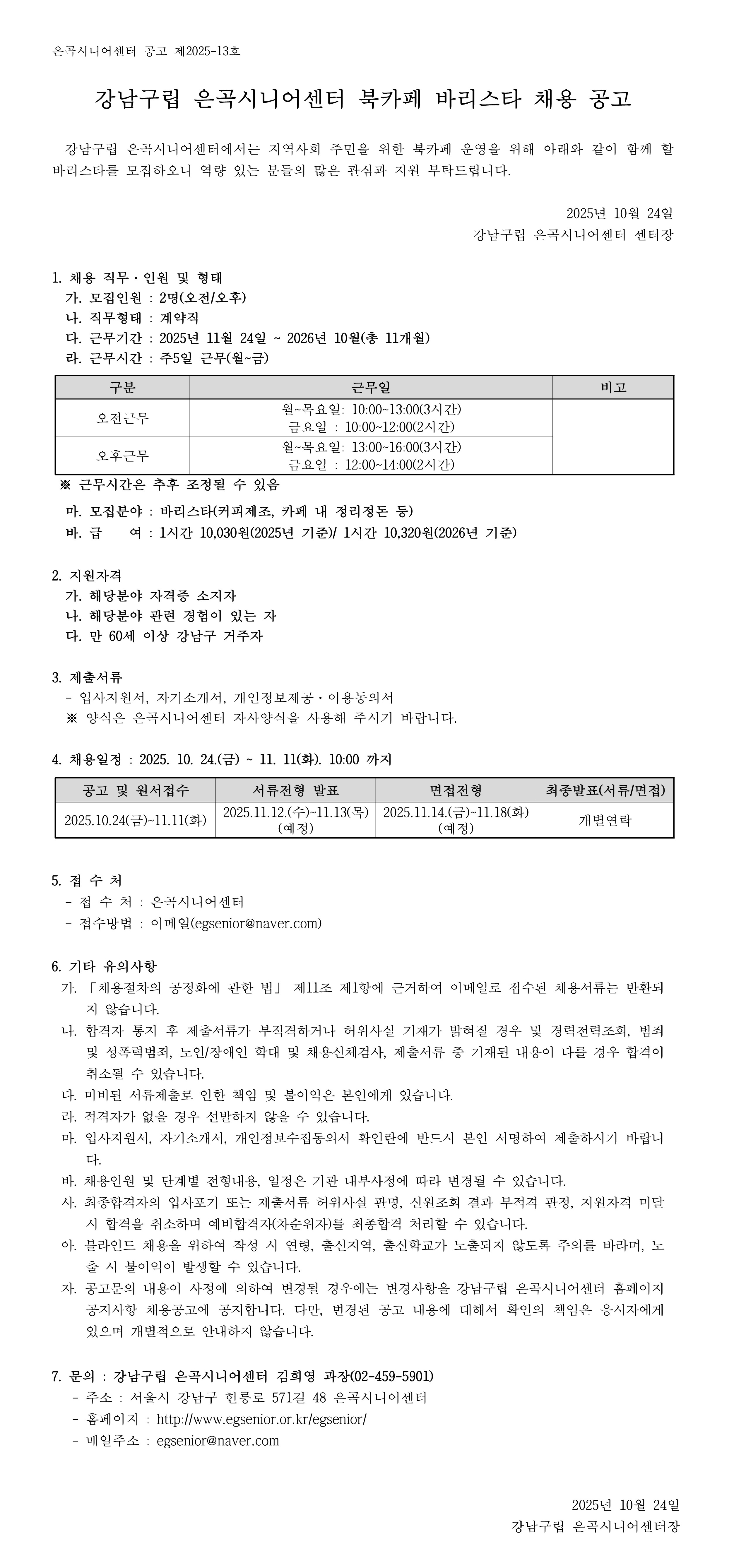 [채용] 강남구립 은곡시니어센터 북카페 바리스타 채용 공고 최고관리자 0 218 10.24 09:36 2025.10.24 16:43 2025-13호_2025년 은곡시니어센터 바리스타 공고.hwp (100.5K) + 6